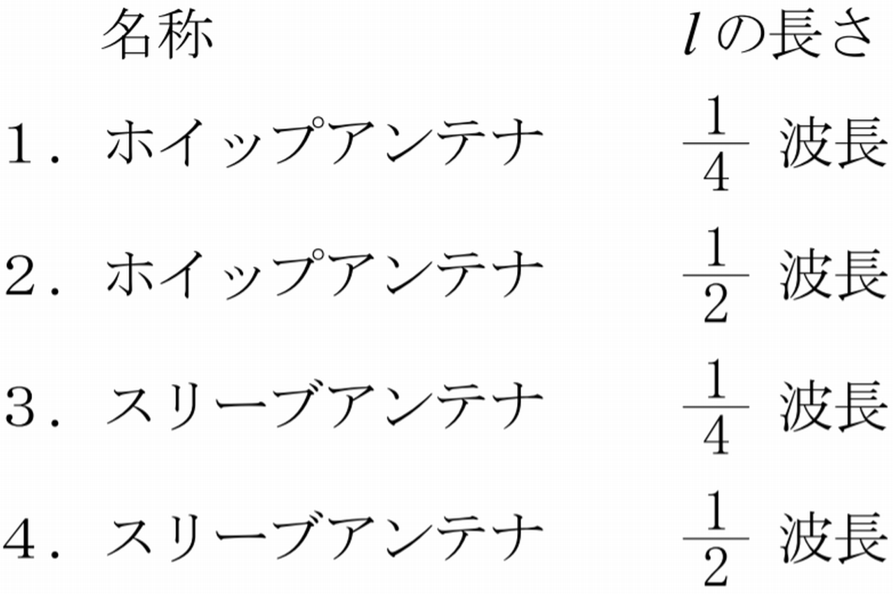 図に示すアンテナの名称と l の長さの組合せで、正しいのはどれか。